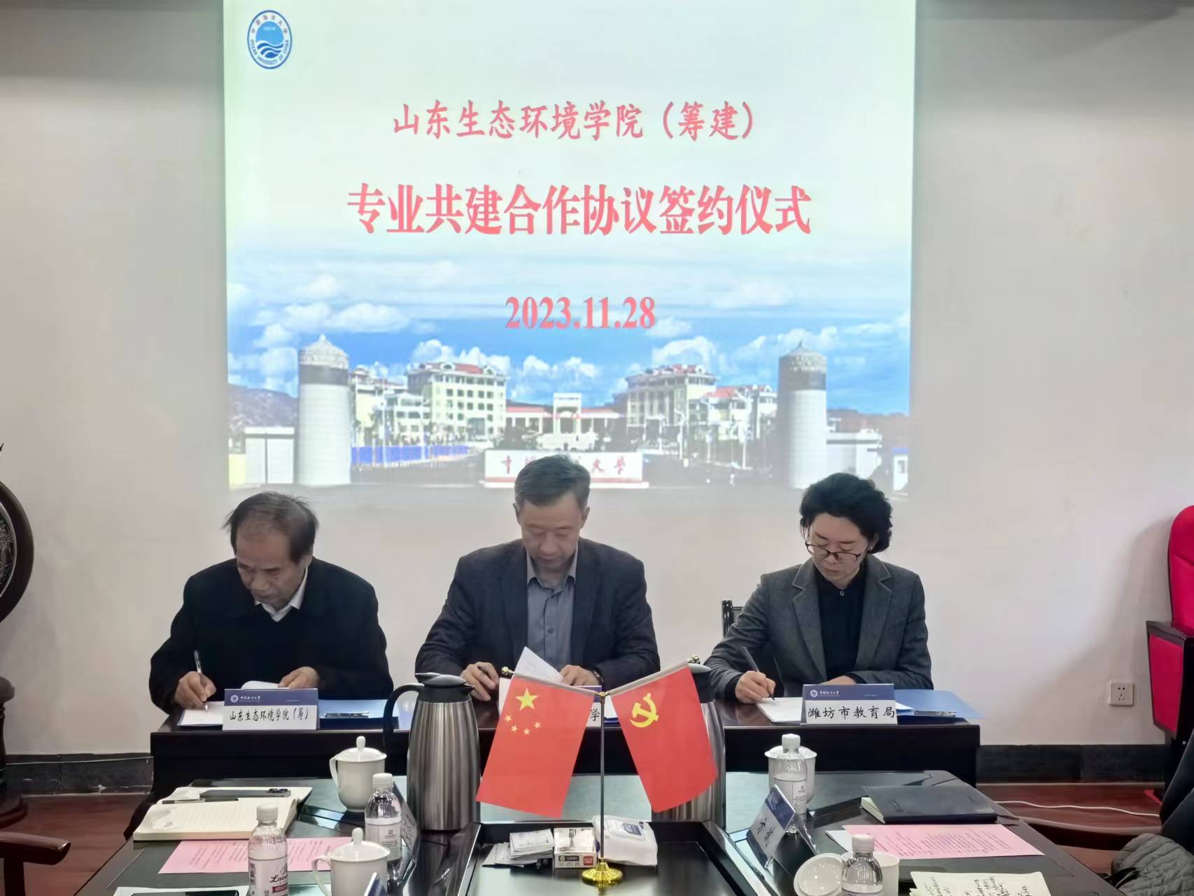 山東生態(tài)環(huán)境學(xué)院(籌建)專業(yè)共建合作協(xié)議簽約儀式在中國海洋大學(xué)環(huán)境科學(xué)與工程學(xué)院舉行,中國海洋大學(xué)職業(yè)技術(shù)師范學(xué)院院長董士軍、濰坊市教育局黨組副書記王妍妮、山東生態(tài)環(huán)境學(xué)院籌建負(fù)責(zé)人(山東海事職業(yè)學(xué)院校長)王敬良出席儀式,并共同簽署《山東生態(tài)環(huán)境學(xué)院籌建期專業(yè)共建合作協(xié)議》,簽約儀式由中國海洋大學(xué)職業(yè)技術(shù)師范學(xué)院副院長劉杰主持。