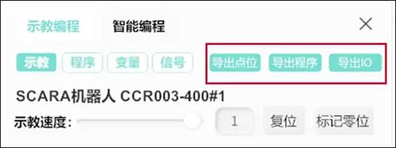 示教面板上方“導(dǎo)出點(diǎn)位”、“導(dǎo)出程序”“導(dǎo)出I0”按鈕,分別支持對當(dāng)前點(diǎn)位表、程序、10的導(dǎo)出。