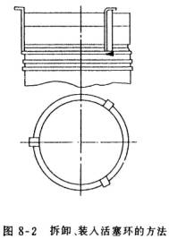 (3) 用專用工具拆活塞環(huán)。見(jiàn)圖8-3。