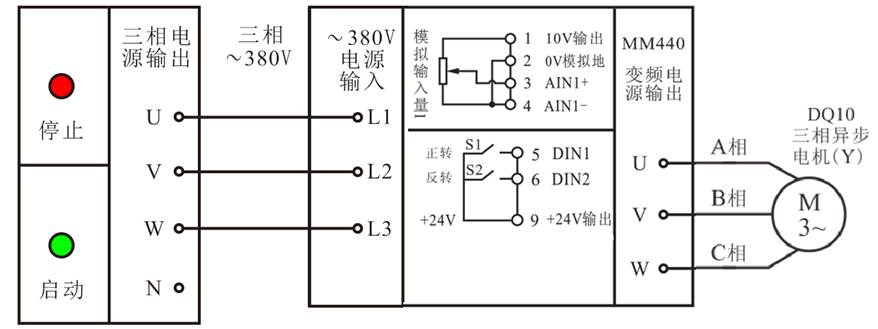 MM440變頻器的“1”、“2”輸出端為用戶的給定單元提供了一個(gè)高精度的+10V直流穩(wěn)壓電源?衫棉D(zhuǎn)速調(diào)節(jié)電位器串聯(lián)在電路中,調(diào)節(jié)電位器, 改變輸入端口AIN1+給定的模擬輸入電壓,變頻器的輸入量將緊緊跟蹤給定量的變化,從而平滑無極地調(diào)節(jié)電動(dòng)機(jī)轉(zhuǎn)速的大小。