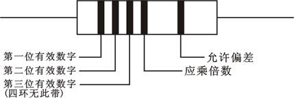 四環(huán)色標(biāo)是在五環(huán)基礎(chǔ)上去除第三環(huán);三環(huán)色標(biāo)是在五環(huán)基礎(chǔ)上去除第三環(huán)和第五環(huán),這時(shí)允許偏差約定為±20%。色標(biāo)的含義見表2-2-3