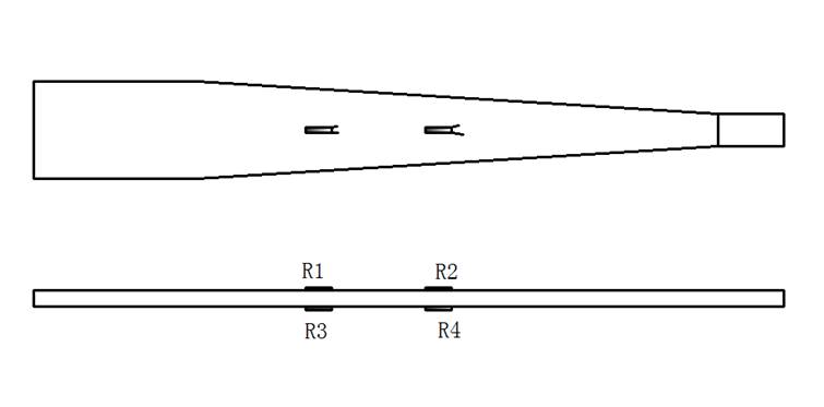 在等強(qiáng)度梁的上下表面沿縱向粘貼了四個電阻應(yīng)變片,用于測定該四點(diǎn)處的應(yīng)變,它們分別是R1,R2,R3, R4,如圖4-1所示。