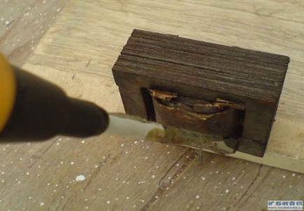 1把變壓器夾在臺(tái)虎鉗上面,不是全夾,夾住大部分,留出若干片鐵心(至少3--5片)不夾。沒(méi)有臺(tái)鉗,可以找塊木版,把變壓器放在上面,邊緣也是留出幾片鐵心的位置懸空。如圖1-2。