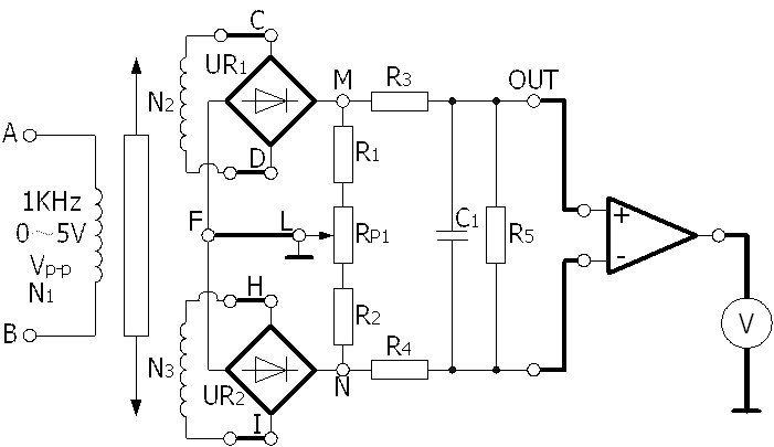 傳感器的兩個次級線圈(N2、N3)電壓分別經(jīng)UR1、UR2兩組橋式整流電路變換為直流電壓,然后相減,經(jīng)過差動放大器放大后,由電壓表顯示出來。R1、R2為兩橋臂電阻,RP1為調(diào)零電位器,R3、R4、C1組成濾波電路,R5為負(fù)載電阻,采用這種差動整流電路可以減少零點殘余電壓。