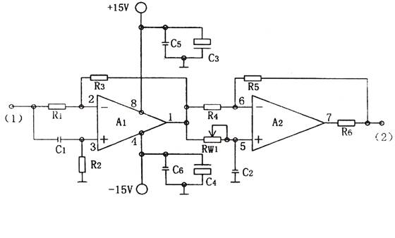 A1與C1、R2組成有源微分網(wǎng)絡,A2與RW1、C2組成有源積分網(wǎng)絡,當①端輸入天弦交流信號μm時,A1輸出一超前μm相位信號,A2輸出一滯后μm相位的信號,通過調(diào)節(jié)RW1可使輸出信號與輸入信號相位發(fā)生變化。