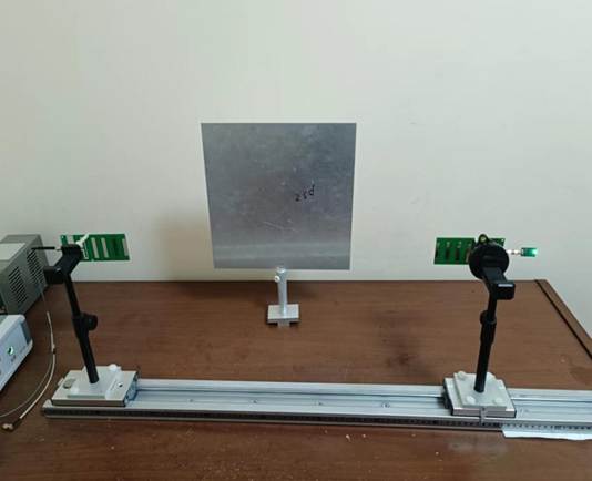 3、 移動(dòng)反射板,如圖所示,將接收八木天線安裝到支架上對(duì)準(zhǔn)反射波來(lái)波方向,注意與反射電場(chǎng)極化匹配。