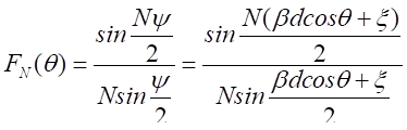 天線陣的總輻射場等于位于原點(diǎn)的陣單元輻射的場乘上一個(gè)因子,這個(gè)因子的出現(xiàn)是由兩個(gè)電流元排列成天線陣而出現(xiàn)的,稱陣因子。歸一化陣因子方向圖函數(shù)可以表示為: