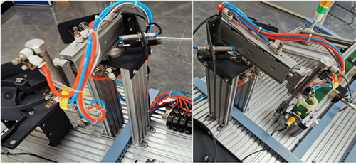 旋轉(zhuǎn)氣缸: 控制機(jī)械手臂的左右轉(zhuǎn),由雙向電控氣閥控制。