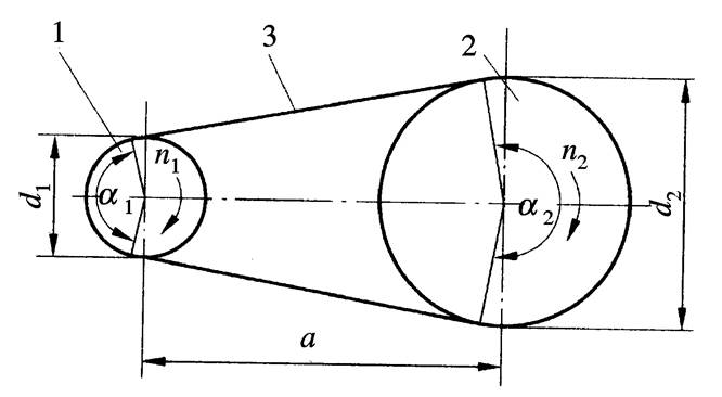 摩擦型帶傳動通常由主動輪、從動輪和傳動帶組成。傳動帶以一定的初拉力F0緊套在帶輪上,在F0的作用下,帶與帶輪的接觸面間產(chǎn)生正壓力,當主動輪1回轉時,接觸面間產(chǎn)生摩擦力,主動輪靠摩擦力使傳動帶3與其一起運動。同時,傳動帶靠摩擦力驅使從動輪2與其一起轉動,從而主動軸上的運動和動力通過傳動帶傳遞給了從動軸。