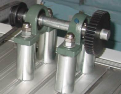 F. 用V帶試著選擇合適的位置,用長T行螺釘、墊圈、螺母固定四個軸承支架和安裝兩個軸承;