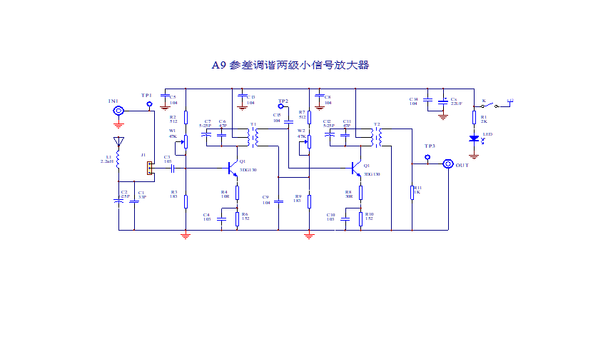 注意:當兩級放大器的中心頻率完全一致時,若各級增益過大極易產生高頻自激,因此,當發(fā)現(xiàn)電路有自激傾向時,可適當調整W1和W2降低工作點電流以略微降低各級增益,或對兩級調諧放大器的微調電容進行相反大小的微調,預置為參差調諧模式,均可有效消除自激傾向。