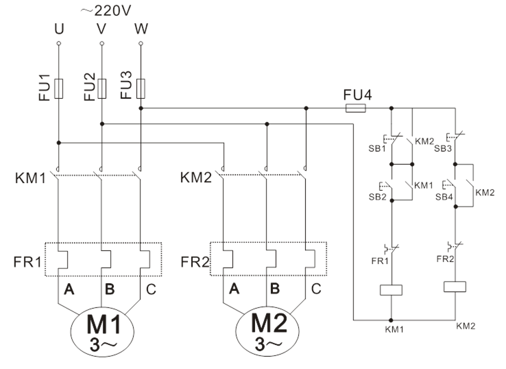 (5)在M1與M2都運(yùn)行時(shí),按下SB1,觀察并記錄電機(jī)及接觸器運(yùn)行狀態(tài)。