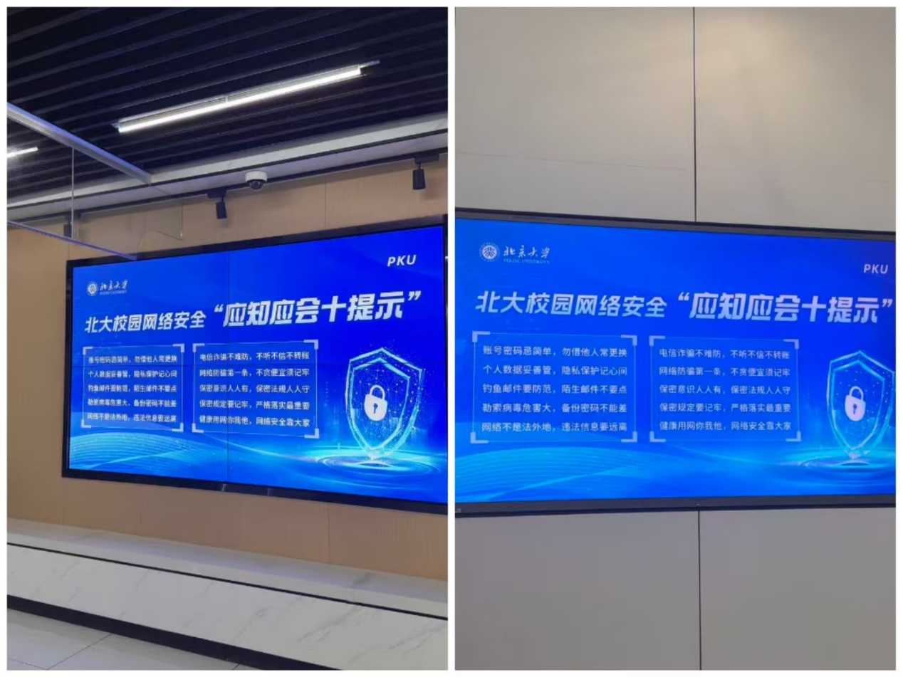 一、通過各種媒體平臺加強(qiáng)網(wǎng)絡(luò)安全宣傳。網(wǎng)信辦、保衛(wèi)部、保密辦等部門通過網(wǎng)站大圖、微信公眾號等媒介,開展網(wǎng)絡(luò)安全主題宣傳。新燕園校區(qū)在公共區(qū)域電子顯示屏發(fā)布《北大校園網(wǎng)絡(luò)安全“應(yīng)知應(yīng)會十提示”》,醫(yī)學(xué)部在逸夫樓、科技樓和宿舍樓大屏輪巡播放網(wǎng)絡(luò)安全宣傳片,深研院則在公共廣場設(shè)置易拉寶,開展網(wǎng)絡(luò)安全主題日活動。