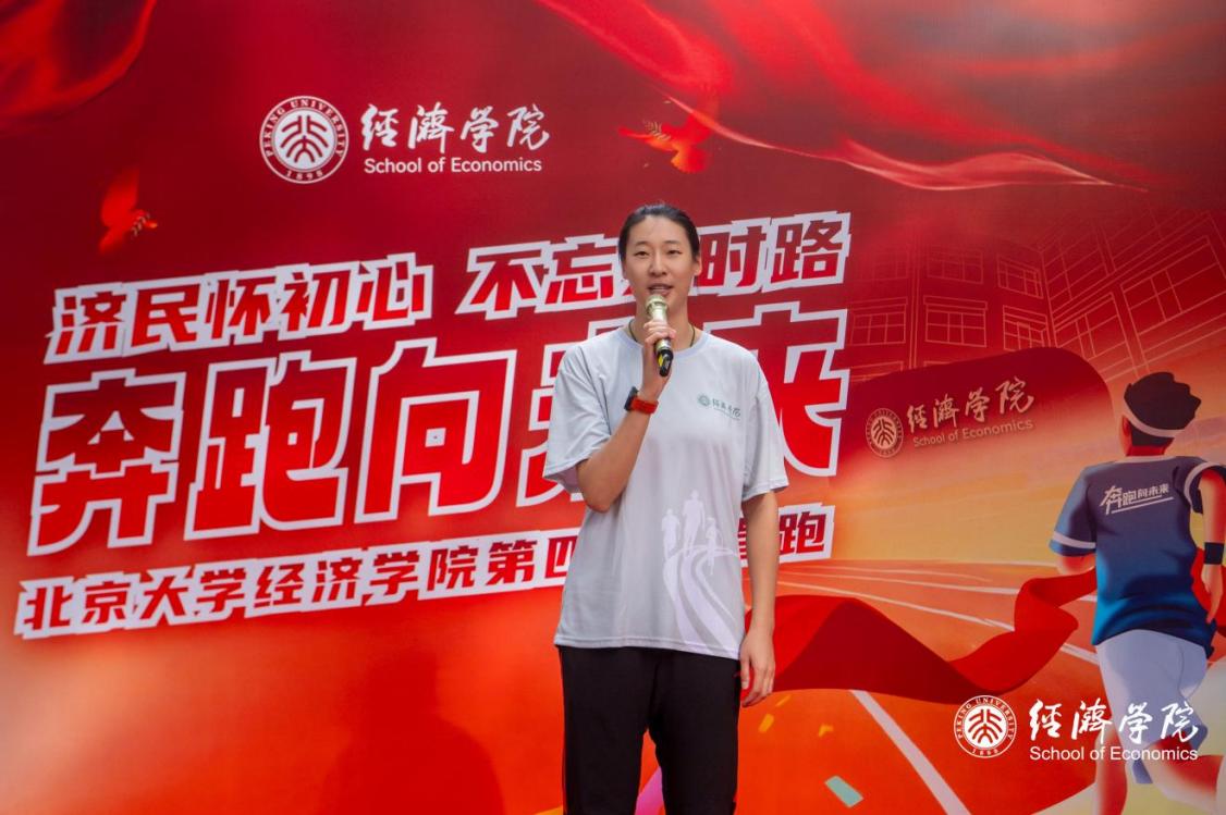 15時,出發(fā)儀式在經(jīng)濟學院院樓前正式開始。擊劍奧運冠軍、北京大學體育教研部教師孫玉潔針結合本次青春跑主題,與師生們分享了自己銘記最深刻的一段“來時路”和支撐自己一步步克服困難、勇往直前的愛國初心。她鼓勵同學們在日常生活中加強體育鍛煉,珍惜在燕園為夢想奔跑的日子,并希望同學們在未來的人生賽道上腳踏實地、持之以恒、無懼挑戰(zhàn),堅定地、勇敢地繼續(xù)奔跑。