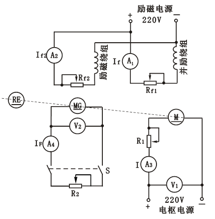 (1)檢查接線是否正確,電表的極性、量程選擇是否正確,電動機(jī)勵磁回路接線是否牢固。然后,將電動機(jī)電樞串聯(lián)起動電阻R1,接好測功機(jī)MG的負(fù)載電阻R2,將MG的磁場回路電阻Rf2調(diào)到阻值最大位置,M的磁場調(diào)節(jié)電阻Rf1調(diào)到最小位置,斷開開關(guān)S,并確認(rèn)斷開控制屏下方右邊的電樞電源開關(guān),作好起動準(zhǔn)備。