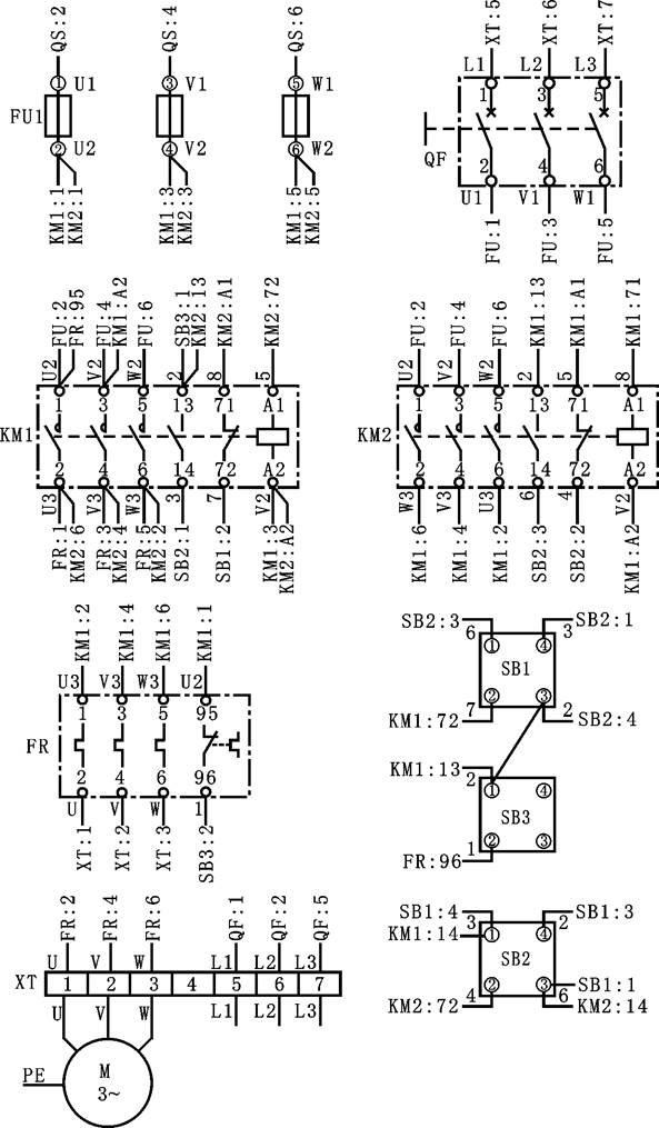按布置圖器件的位置,在WD-21、WD-22掛板上選擇QF、FU、KM1、KM2、FR、SB1、SB3、SB2、XT等器件。圖5C(b)為用中斷線表示的單元接線圖,每個器件端子處接的線號及端子之間的連線圖上已明確示出。對接線和查線帶來很大方便。安裝與接線后,應符合第二章的要求。