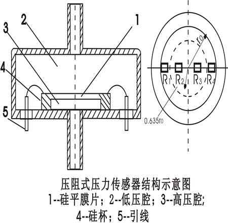 硅平膜片上的擴散電阻通常構成橋式測量電路,相對的橋臂電阻是對稱布置的,電阻變化時,電橋輸出電壓與膜片所受壓力成對應關系。上圖所示為一種壓阻式壓力傳感器的結構示意圖,硅平膜片在圓形硅杯的底部,硅杯的內外兩側輸入被測壓力及參考壓力,本套裝置的傳感器參考壓力為當地大氣壓力。壓力差使膜片變形,膜片上的兩對電阻阻值發(fā)生變化,使電橋輸出相應壓力變化的信號。為了補償溫度效應的影響,一般還可在膜片上沿對壓力不敏感的晶向生成一個電阻,這個電阻只感受溫度變化,可接入橋路作為溫度補償電阻,以提高測量精度。