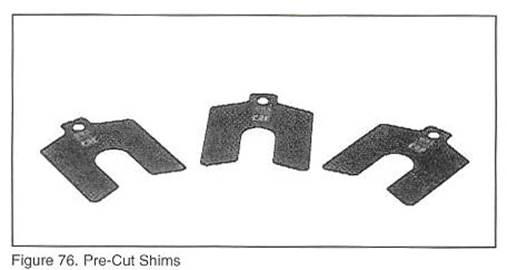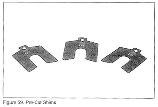 H.在電機(jī)的兩只腳下插入相應(yīng)厚度的調(diào)整墊片(按步驟F中所計(jì)算出的墊片厚度),前兩只或者后兩只都可以,這樣可以使得軸上的水平儀氣泡處于中心位置。采用如圖59所示調(diào)整墊片,它們放在儲物柜的抽屜1中。