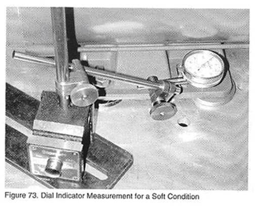 F. 將百分表的探針放在接近電機(jī)安裝螺栓的位置上,如圖73所示,將指針調(diào)零,調(diào)整百分表使得它的探針與支撐墊塊接近垂直,如圖所示,盡量接近90度。