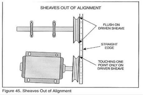 圖45所示。如果主動帶輪沒有任何部分與米尺接觸上,則說明兩軸不平行或是帶輪未對準(zhǔn)。