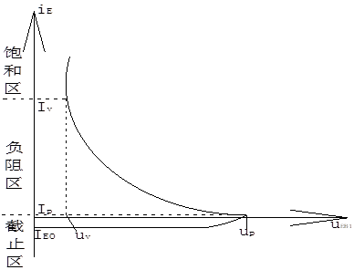 單結(jié)晶體管的特性曲線如圖2-2-14所示當(dāng)UBE1=0時(shí),IE=IEO;當(dāng)UEB1增大至UP(峰點(diǎn)電壓時(shí)),PN結(jié)開始正向?qū),此時(shí)IE=IP(峰點(diǎn)電流);UEB1再增大一點(diǎn)管子就進(jìn)入負(fù)阻區(qū),隨著IE增大,UEB1減小,直至UEB1=UV(谷點(diǎn)電壓),IE=IV(谷點(diǎn)電流),UV取決于PN結(jié)的導(dǎo)通電壓和rb1 的飽和電阻rs;當(dāng)IE再增大,管子進(jìn)入飽和區(qū)。單結(jié)晶體管的三個(gè)區(qū)如圖2-2-14所標(biāo)注。