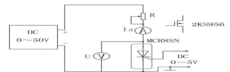 首先將絕緣柵型場效應(yīng)管(2KS956)接入主電路,主電路直流0~50V電源用屏上直流電樞電源,控制回路電源用0~30V直流可調(diào)穩(wěn)壓電源,把30V可調(diào)穩(wěn)壓電源電位器沿逆時(shí)針旋到底, 電位器選元器件測試箱上的1K\2W的電位器;電流表選用控制屏上20mA~2000mA的直流檔,直流電壓表選用100V的電壓檔