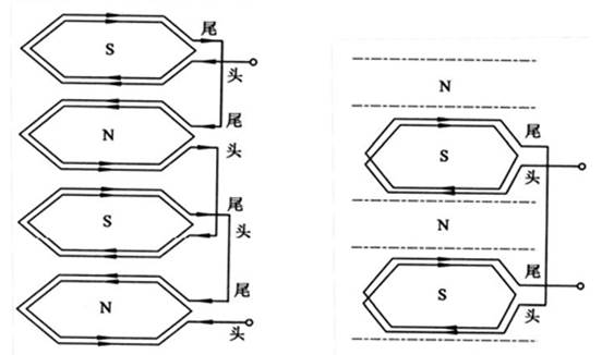 · 極相組的連接。在一個(gè)極下的,屬于同一相的所有線圈串聯(lián)在一起,稱為一個(gè)極相組。為了保證三相電動(dòng)機(jī)線圈連接之后,能形成 N 極和 S 極相間的排列,各極相組之間的連接,必須是頭頭相拉,如圖 5-1(a)所示。但也有如圖 5-1(b)所示的頭尾相接,這時(shí)可以看到,同樣是四極三相電動(dòng)機(jī),它只有兩個(gè)極相組,因而它必須是頭尾相接,才能形成四極的磁場(chǎng),但此種接法通常用于單繞組多速三相電動(dòng)機(jī)。在中小型電動(dòng)機(jī)中,一個(gè)極相組內(nèi)的線圈一般是連續(xù)繞制的,因此不用接頭。(a)頭頭和尾尾相接 (b)頭尾相接