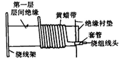 2)一層電纜紙與一層黃臘布重疊在一起繞兩周后用膠水粘牢,作為繞組對鐵芯間的絕緣。