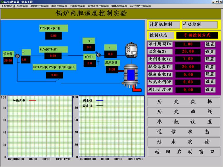 6.點擊“確認”,用戶登錄完畢。選擇“單回路控制實驗”下拉菜單中的“鍋爐內膽溫度控制實驗”。出現如下的“鍋爐內膽溫度控制實驗”界面。