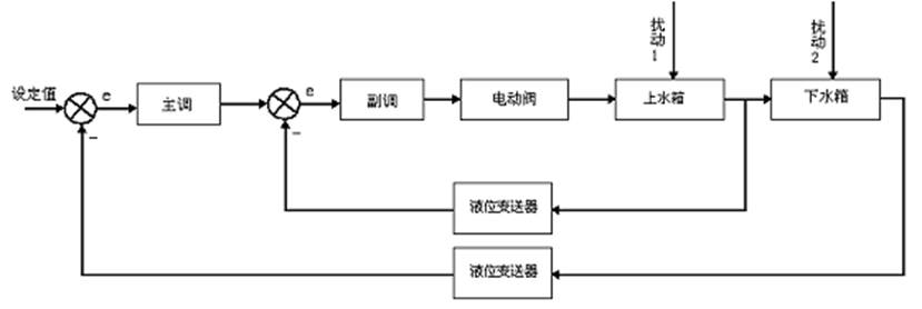 本實驗采用儀表控制,將上水箱液位控制在設(shè)定高度。串級回路是由內(nèi)反饋組成的雙環(huán)控制系統(tǒng),屬于復(fù)雜控制范疇。根據(jù)下水箱的液位信號輸出給儀表,作為主調(diào)節(jié)器輸入,主調(diào)節(jié)器的輸出作為副調(diào)節(jié)器的輸入,在串級控制系統(tǒng)中,兩個調(diào)節(jié)器任務(wù)不同,因此要選擇調(diào)節(jié)器的不同調(diào)節(jié)規(guī)律進行控制,副調(diào)節(jié)器主要任務(wù)是快速動作,迅速抵制進入副回路的擾動,至于副回路的調(diào)節(jié)不要求一定是無靜差。主調(diào)節(jié)器的任務(wù)是準確保持下水箱液位在設(shè)定值,因此,主調(diào)節(jié)器采用PI調(diào)節(jié)器也可考慮采用PID調(diào)節(jié)器。上下水箱雙容串級控制方塊原理圖如下: