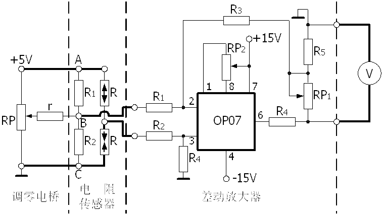 將兩個受力方向不同的應(yīng)變片電阻分別接入電橋的兩個相鄰橋臂,組成半橋形式的測量電路,轉(zhuǎn)換電路的輸出靈敏度提高,非線性得到改善。