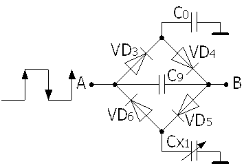 固定頻率的方波脈沖由A點輸入,在方波的上升沿,C0被充電,充電途徑是VD3→C0;與此同時,Cx1也被充電,其充電途徑是C9→VD5→Cx1。在方波的下降沿,C0和Cx1都放電,C0的放電途徑是C0→VD4→C9;Cx1的放電途徑是Cx1→VD6。由于C9在一個周期內(nèi)的充電和放電平均電流分別為:IU=fVPCx1和ID=fVPC0,式中f是脈沖頻率,VP為方波峰值電壓,因此AB間的平均電流I=ID-IU=fVP(C0-Cx1)。從該式中可以看出電容的變化與AB間的電路成正比。