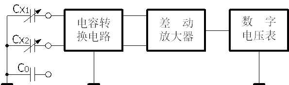 實驗電路框圖如圖8-1所示。與實驗七不同之處在于接入電容轉(zhuǎn)換電路的兩個電容都為可變電容,當電容傳感器的動極移動時,兩個電容的電容量都發(fā)生變化,但變化方向相反,這樣就構(gòu)成差動式的電容傳感器。
