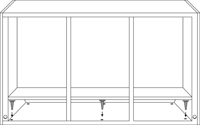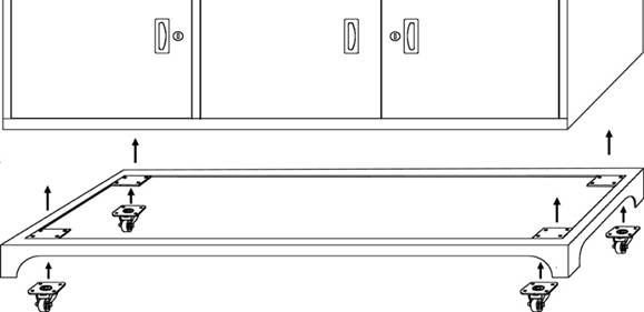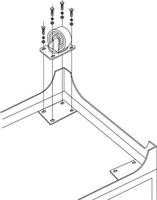 ② 將桌體翻轉,圍板與萬向輪一同安裝到實驗臺桌身,注意孔位對齊。按照右圖所示
