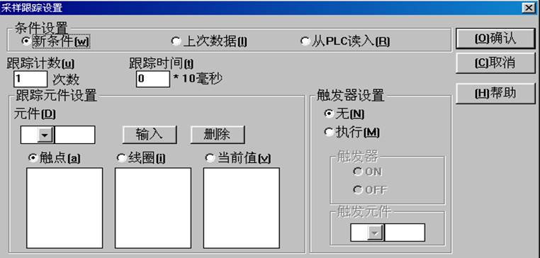 (3)采樣跟蹤 采樣跟蹤的目的在于存儲與時間相關的元件數(shù)值變化,并將其時間表中加以顯示;或在PLC中設置采樣條件,顯示基于PLC采樣數(shù)據(jù)的時間表。操作方法是執(zhí)行[PLC]-[采樣跟蹤]-[參數(shù)設置]菜單,如圖2-14所示;并在顯示的對話框中設置各項條件,如圖2-15所示,再執(zhí)行[運行]、[顯示]、[從記錄文件中讀入]、[寫入記錄文件]菜單命令即可。