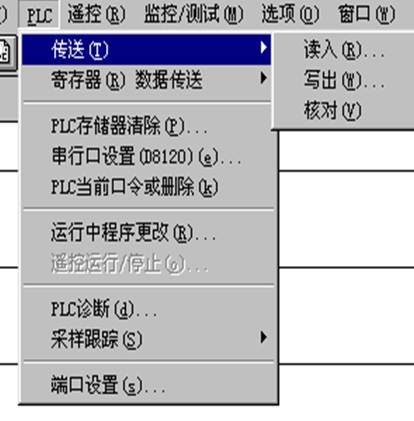 (1)程序傳送 將已創(chuàng)建的順控程序成批傳送到PLC中。傳送功能包括讀入、寫出以及校驗,操作方法由執(zhí)行[PLC]-[傳送]-[讀入]、[寫出]、[校驗]菜單操作完成,如圖2-11所示。當選擇[讀入]時,應在[PLC類型設置]對話框中將已連接的PLC類型設置好,其操作窗口如圖2-12所示。