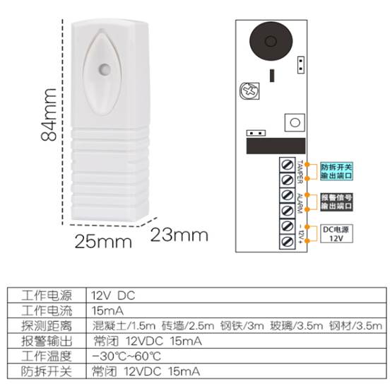 震動(dòng)傳感器按在需要防范的地方,當(dāng)有不法分子試圖強(qiáng)行打開,撬開時(shí)振動(dòng)傳感器監(jiān)測到有異常振動(dòng)聲音時(shí)就會(huì)立即發(fā)送報(bào)警信號(hào)給報(bào)警主機(jī)驅(qū)動(dòng)喇叭現(xiàn)場警示并通知相關(guān)人員有警情發(fā)生,本教材所用振動(dòng)傳感器體積小巧,安裝方便不占空間更加隱蔽,適合各類需要防范設(shè)備的安裝。4.4.1 傳感器參數(shù)