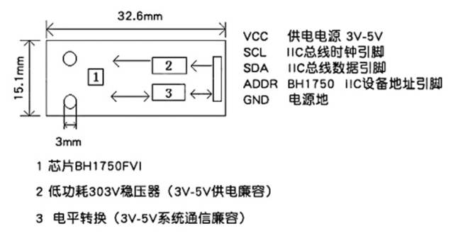 1、采用 ROHM-BH1750FV芯片;2、供電電源:3-5V;