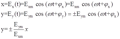 如果Ex和Ey同相,或者相差180°,則這兩個(gè)分量的合成矢量的空間取向就始終在一條直線上,這就是說在式中如果fx-fy=0或fx-fy=p就代表一個(gè)直線極化的均勻平面電磁波。