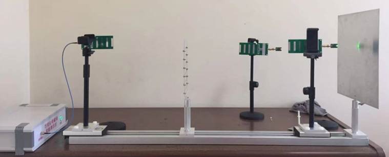 然后將天線按照發(fā)射天線的極化方式,調(diào)整相應(yīng)的擺放方向,調(diào)整天線與電場的關(guān)系,使得電場在天線上激起較強(qiáng)的感應(yīng)電流,繼而通過電路轉(zhuǎn)換為相應(yīng)的電壓。在實(shí)驗(yàn)臺上通過不斷調(diào)整感應(yīng)裝置的位置,觀察檢測電壓的變化規(guī)律,通過尋找極大值和極小值的方式測量極值之間的距離,通過預(yù)設(shè)電磁波頻率推算出相應(yīng)的波長的理論值與測試值作對比,來驗(yàn)證理論和實(shí)驗(yàn)的一致性。