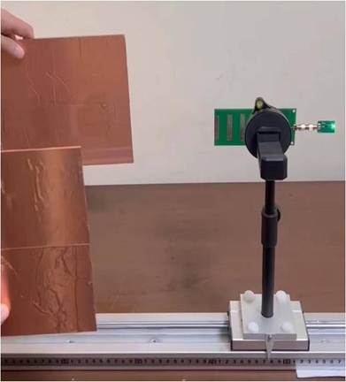 4、移動反射板,觀察LED燈是否有明暗的變化,如果不亮可以將接收天線向發(fā)射天線移動,可以測試不同顏色的LED燈被點(diǎn)亮的距離。