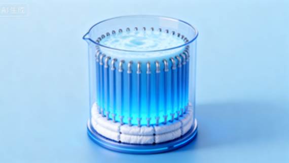 重點(diǎn)展示裝置結(jié)構(gòu)(含容器、石蠟、換熱管、保溫層)。風(fēng)格為簡(jiǎn)約科技風(fēng),藍(lán)色調(diào)為主,突出熱量流動(dòng)示意(紅色箭頭表吸熱,藍(lán)色箭頭表放熱)。
