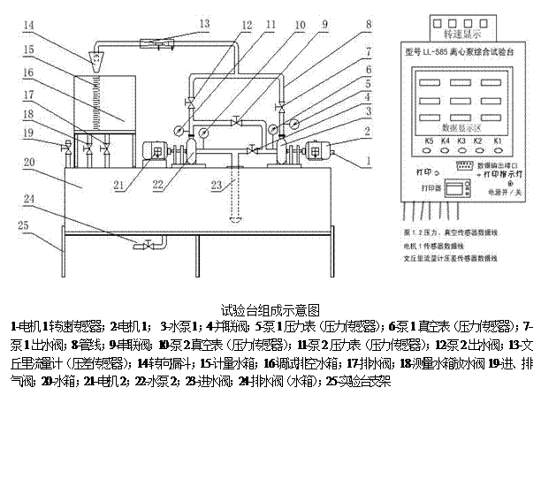 實(shí)驗(yàn)裝置由兩臺離心泵綜合試驗(yàn)臺和兩臺計(jì)算機(jī)組成。試驗(yàn)臺的組成及設(shè)備如下圖所示: