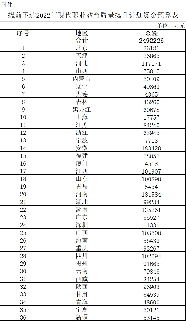 為加快預(yù)算執(zhí)行進度,提高預(yù)算編制的完整性,現(xiàn)提前下達你。ㄗ灾螀^(qū)、直轄市、計劃單列市,下同)2022年現(xiàn)代職業(yè)教育質(zhì)量提升計劃資金預(yù)算(項目代碼:Z135050009055),詳見附件。收入列2022年政府收支分類科目“1100245教育共同財政事權(quán)轉(zhuǎn)移支付收入”,支出列“205教育支出”相關(guān)項。待2022年預(yù)算年度開始后,按程序撥付使用,F(xiàn)將有關(guān)事項通知如下: