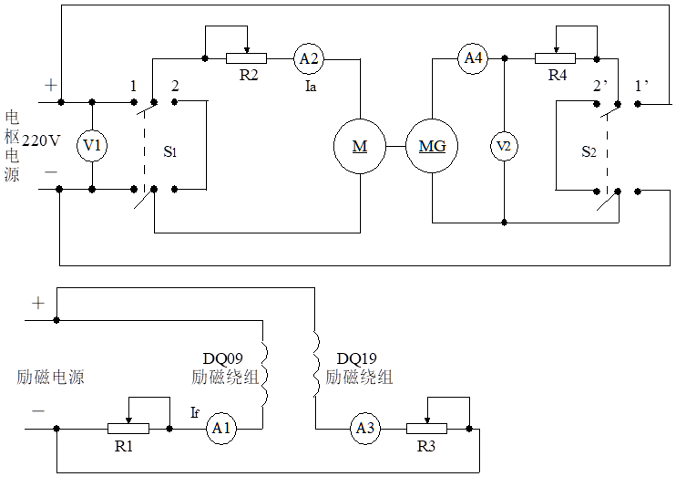 按圖4-1接線,圖中M用編號為DQ09的直流并(他)勵電動機(接成他勵方式),MG用編號為DQ19的校正直流測功機,直流電壓表V1、V2的量程為300V,直流電流表A1、A3的量程為200mA,A2、A4的量程為5A。R1、R2、R3、及R4依不同的實訓而選不同的阻值。