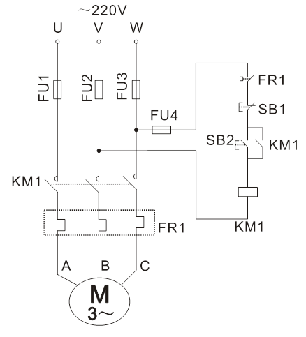 按下控制屏上“停止”按鈕切斷三相交流電源后,按圖5-8接線,圖中SB1、SB2、SB3、KM1、FR1、FU1、FU2、FU3、FU4為掛件GDQ39-1上的器件,電機(jī)選用DQ10(△/220V)。