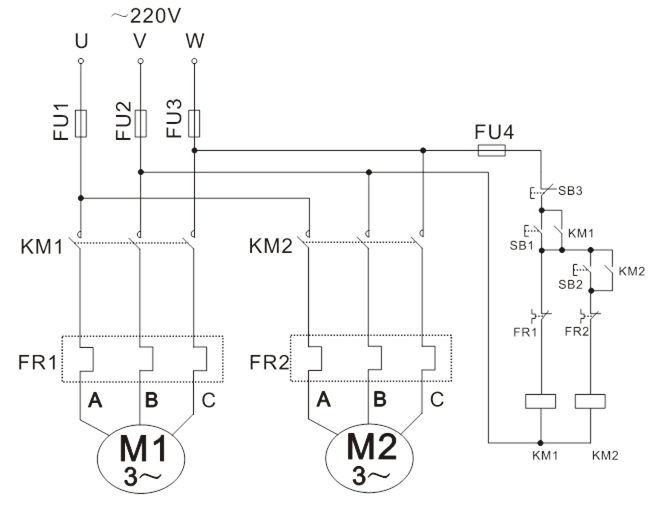 (5)在M1與M2都運(yùn)行時(shí),按下SB3,觀察并記錄電機(jī)及接觸器運(yùn)行狀態(tài)。