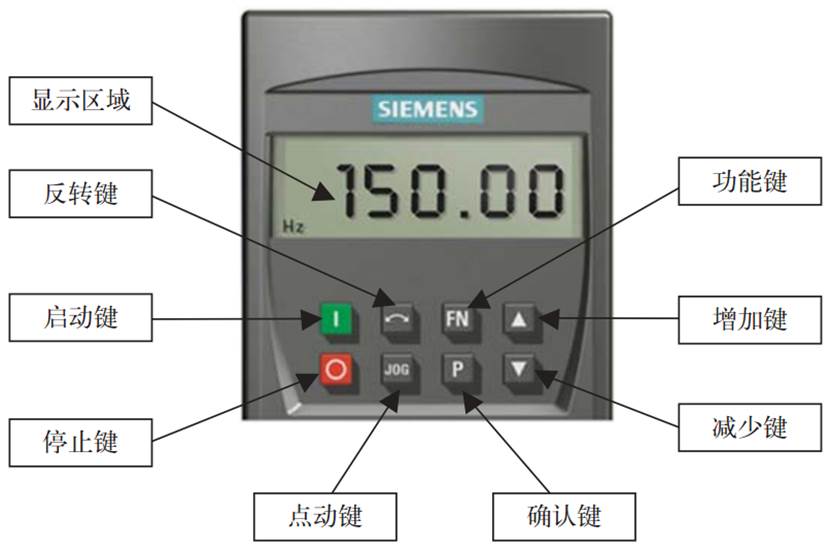 利用變頻器的操作面板和相關(guān)參數(shù)設(shè)置,即可實(shí)現(xiàn)對(duì)變頻器的某些基本操作如正反轉(zhuǎn)、點(diǎn)動(dòng)等運(yùn)行。變頻器面板的介紹及按鍵功能說明如下圖,具體參數(shù)號(hào)和相應(yīng)功能參照系統(tǒng)手冊(cè)。