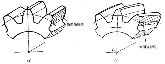 直齒圓柱齒輪嚙合時(shí),輪齒接觸線是一條平行于軸線的直線,并沿齒面移動(dòng),如圖4-1(a)所示。 所以在傳動(dòng)過(guò)程中,兩輪齒將沿著整個(gè)齒寬同時(shí)進(jìn)入嚙合或同時(shí)退出嚙合,因而輪齒上所受載荷也是突然加上或突然卸下, 傳動(dòng)平穩(wěn)性差,易產(chǎn)生沖擊和噪聲。