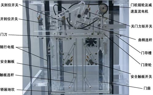 本教學(xué)電梯采用了單扇中分門結(jié)構(gòu)的門機(jī)傳動機(jī)構(gòu)。門機(jī)以直流減速電機(jī)為動力,通過門機(jī)鏈條傳動。傳動鏈輪上安裝有曲柄桿,曲柄桿的兩端分別與門扇驅(qū)動連桿相連。帶動門扇的開與關(guān)。如圖所示電梯門按開門方式可分中分門、旁開門。中分門有單扇中分、雙折中分;旁開門有單扇旁開、雙扇旁開、三扇旁開。電梯的門按安裝位置可分為轎門和層門(或廳門)。層門裝在建筑物每層電梯停站的門口,掛在層門上坎上面。轎門則掛在轎廂上坎上面,與電梯一起上升、下降。層門通過轎門上的門刀插入進(jìn)行開門或閉門。